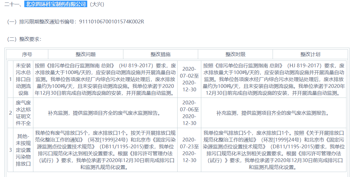 而之前的2015年,科宝制药投产项目涉及未验先投;2017年4月5日,科宝制药排放水污染物超过水污染物排放标准,被责令停止违法行为,限期改正,处应缴纳年排污费的2倍的罚款(即人民币壹万零壹百壹拾玖元叁角陆分)。2020年科宝制药未安装污水总排口自动测流设施、废气废水达标证明文件不全,未按规定设置污染物排放口,被要求整改。
