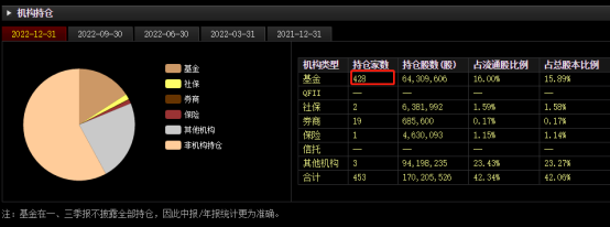 不过,作为医药行业的大白马,长春高新依然是众多公募基金青睐的标的。数据显示,截止2022年四季度末,共有428只基金的十大重仓股中持有长春高新。