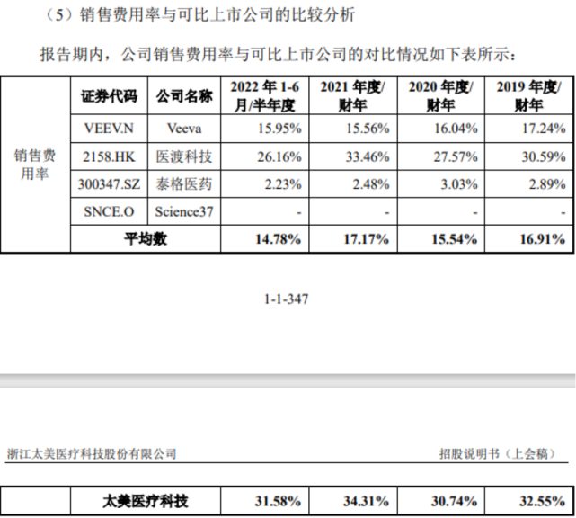 另外,值得市场关注的两个指标。太美医疗销售费用分别为6297.61万元、9647.41万元、1.60亿元及7789.96万元,占营业收入比例为32.55%、30.74%、34.31%及31.58%。而与可比上市公司的销售费用率平均数比较,太美医疗则显得尤其之高。