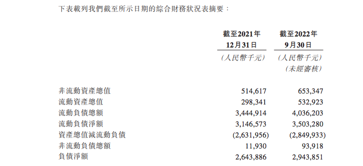 截至2021年及截至2022年9月30日,科伦博泰来自母公司的借款分别为23.58亿及27.61亿,同期分别录得的负债净额为26.44亿元及29.44亿元,同期的流动负债净额更是高达31.47亿、35.03亿元。