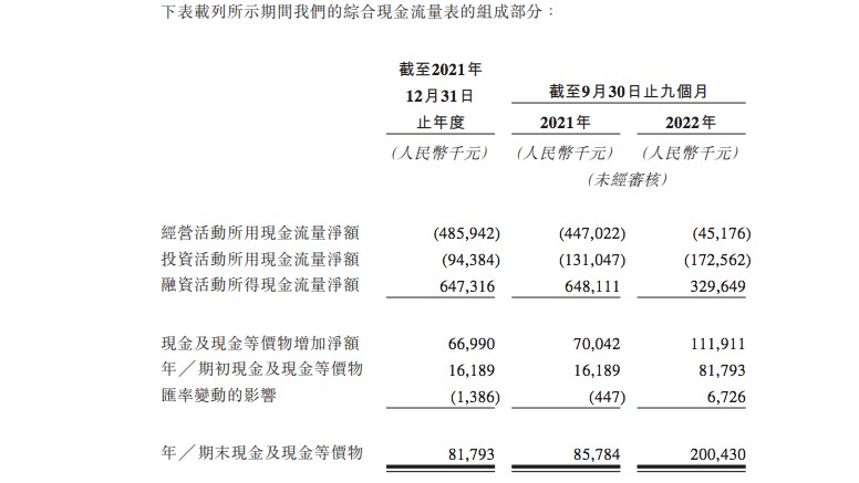 净亏损带来的直接后果就是公司经营活动现金流的持续流出。2021年,这一数值还有4.86亿元,到2022年前9个月,净流出额已经骤降至4518万元。
