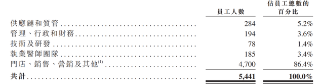 从人员结构看,在总共5441名员工中,技术及研发仅仅78人,占比为1.4%。执业医师团队也只有185人,大量的人员分布在门店、销售、营销及其他,达4700人,占比86.4%。