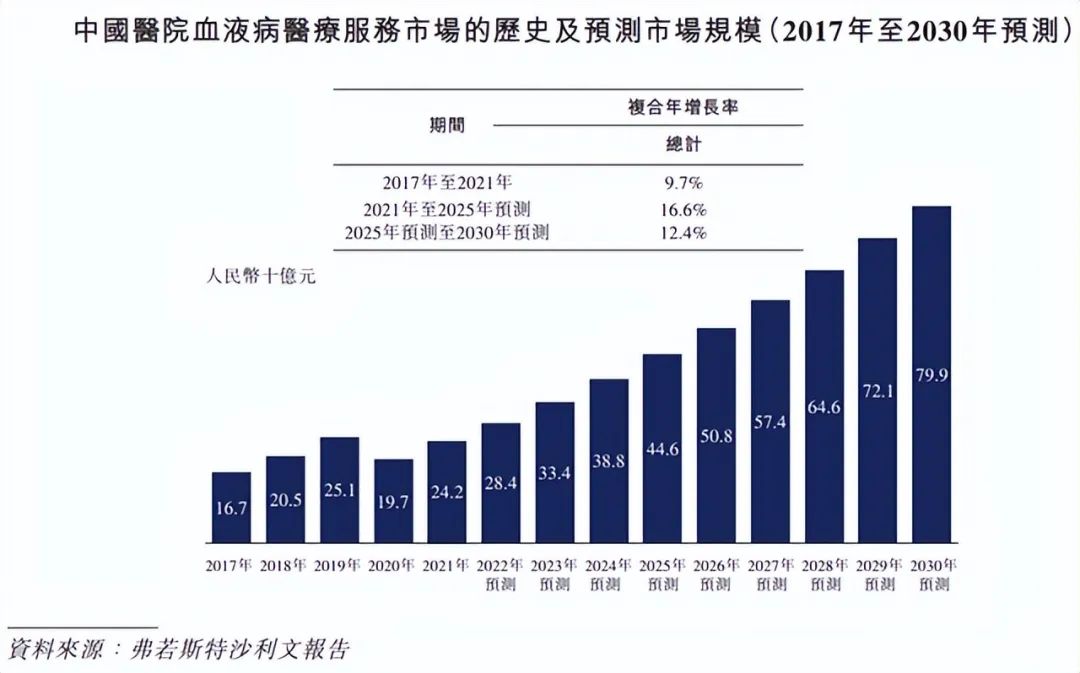 数据显示,近年来我国血液病发病人数呈现出持续上升态势。根据弗若斯特沙利文报告,中国血液病医疗服务的总市场规模从2017年的167亿元增长至2021年的242亿元,复合年增长率为9.7%。预期2025年进一步增长至446亿元,2030年增长至799亿元,超过同期中国整体医疗服务市场的增长。