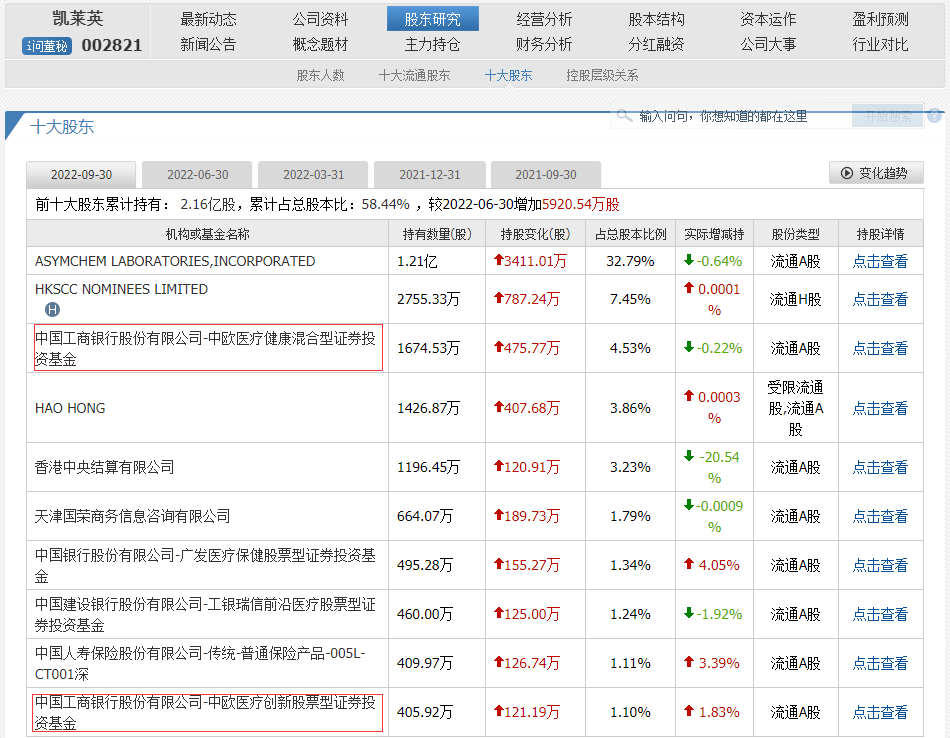 2019年二季度,葛兰开始接入凯莱英,后来逐渐加仓并进入十大持仓股。而从2022年三季报看,葛兰旗下的两大基金分别占据了凯莱英十大股东的第三名和第十名,其中特别是中欧医疗健康混合型证券投资基金,以1674.53万股成为了所有持仓基金中持股数的绝对第一。