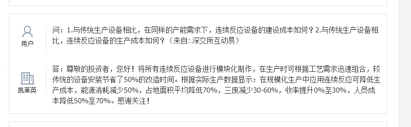 凯莱英在投资者互动平台表示,公司连续性反应技术与生物酶催化技术等新技术在公司临床中后期项目中的应用率超过30%。公司在未来新建产能中大力推进新技术的使用,此外,该工艺可以使多项成本降低30%—70%。
