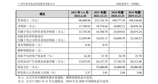 然而,在招股书可见的2019年以来,公司业绩尤其是净利润水平却每况愈下。数据显示,2019-2022年上半年,环亚科技分别实现营收19.41亿元、19.88亿元、21.57亿元、9.86亿元,同期净利润分别为2.04亿元、2.41亿元、1.87亿元、1.37亿元。