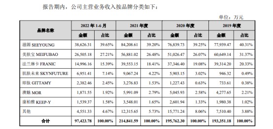 业绩水平表现不佳,也与主力品牌的营收缩水相关。招股书显示,2019-2022年上半年,滋源营收占比分别为40.31%、39.25%、39.20%、39.65%;美肤宝营收占比分别为31.37%、26.07%、26.48%、27.21%;法兰琳卡营收占比分别为20.33%、19.08%、18.41%与15.39%。可以看出,近三年半时间以来,三大品牌营收正在以肉眼可见的速度缩水。