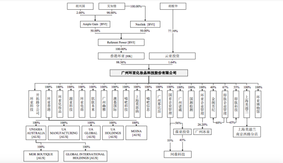招股书显示,环亚科技的股权架构十分简单,由香港环亚(持股98.36%)和云亚投资(持股1.64%)两部分组成。其中香港环亚由创始人胡兴国持股2%、吴知情(胡兴国配偶)持股98%,此外,胡根华(胡兴国之子)又在云亚投资持股77.39%。相当于实控人胡兴国、吴知情、胡根华合计控制公司98.36%的股权表决权。